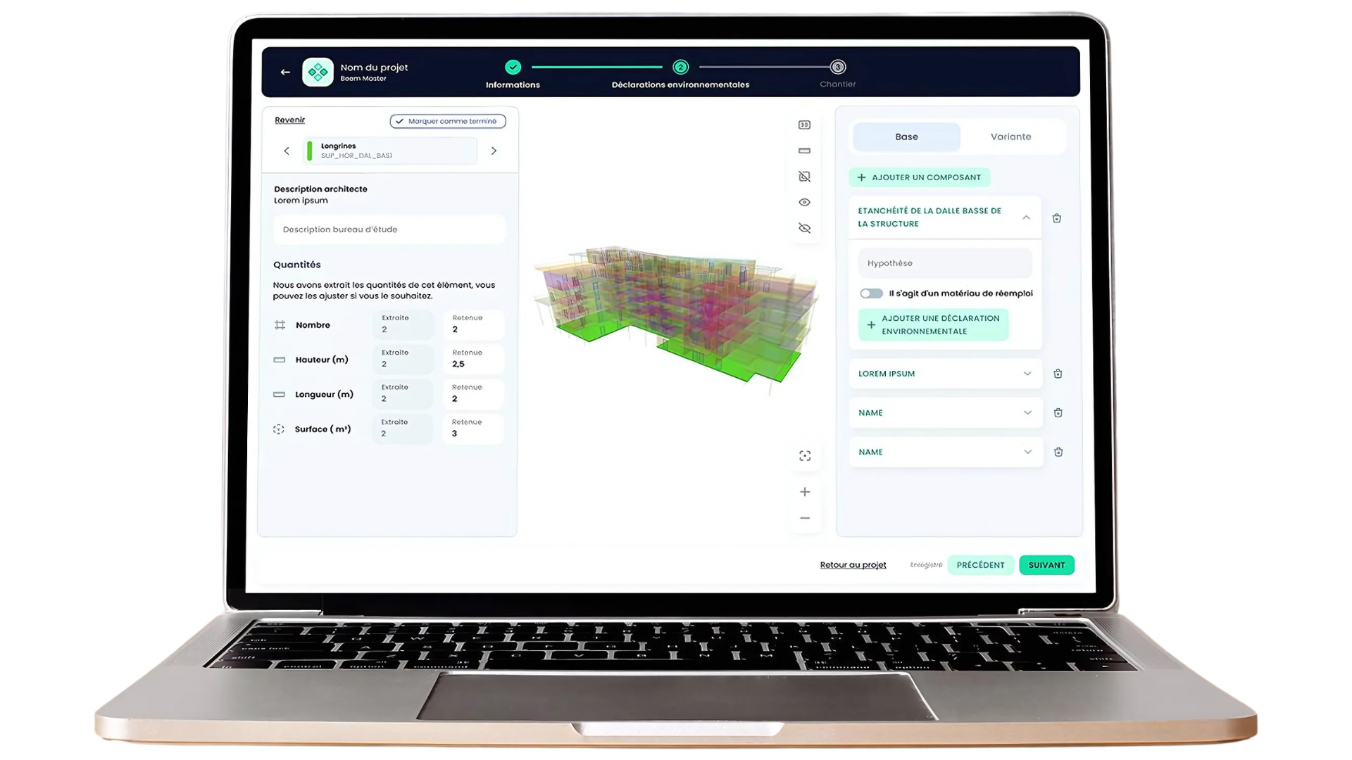 Il suffit de disposer des éléments essentiels (murs, fenêtres, toitures) pour que le calcul carbone s’opère automatiquement à partir de vos volumes réels.