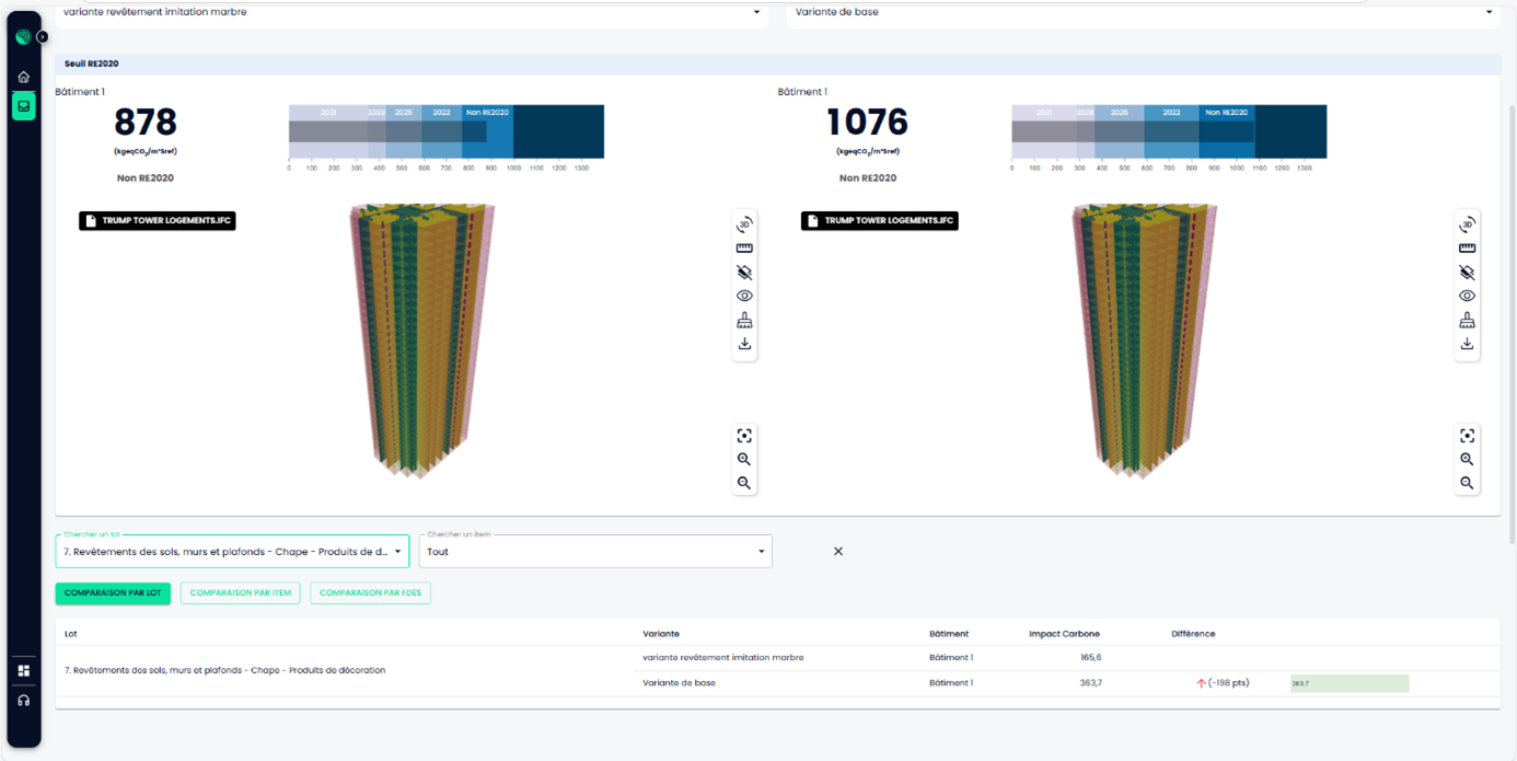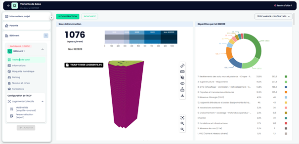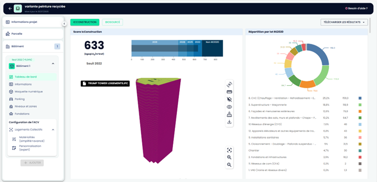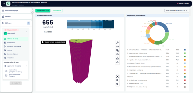 Pour cette étude, nous avions imaginé la Trump Tower à Clermont-Ferrand, en la considérant sous l’angle RE2020. L’analyse carbone a été réalisée avec Beem Shot, notre plateforme d’estimation carbone pour les agences d’architecture, permettant de mesurer et de réduire l’impact carbone des projets RE2020.