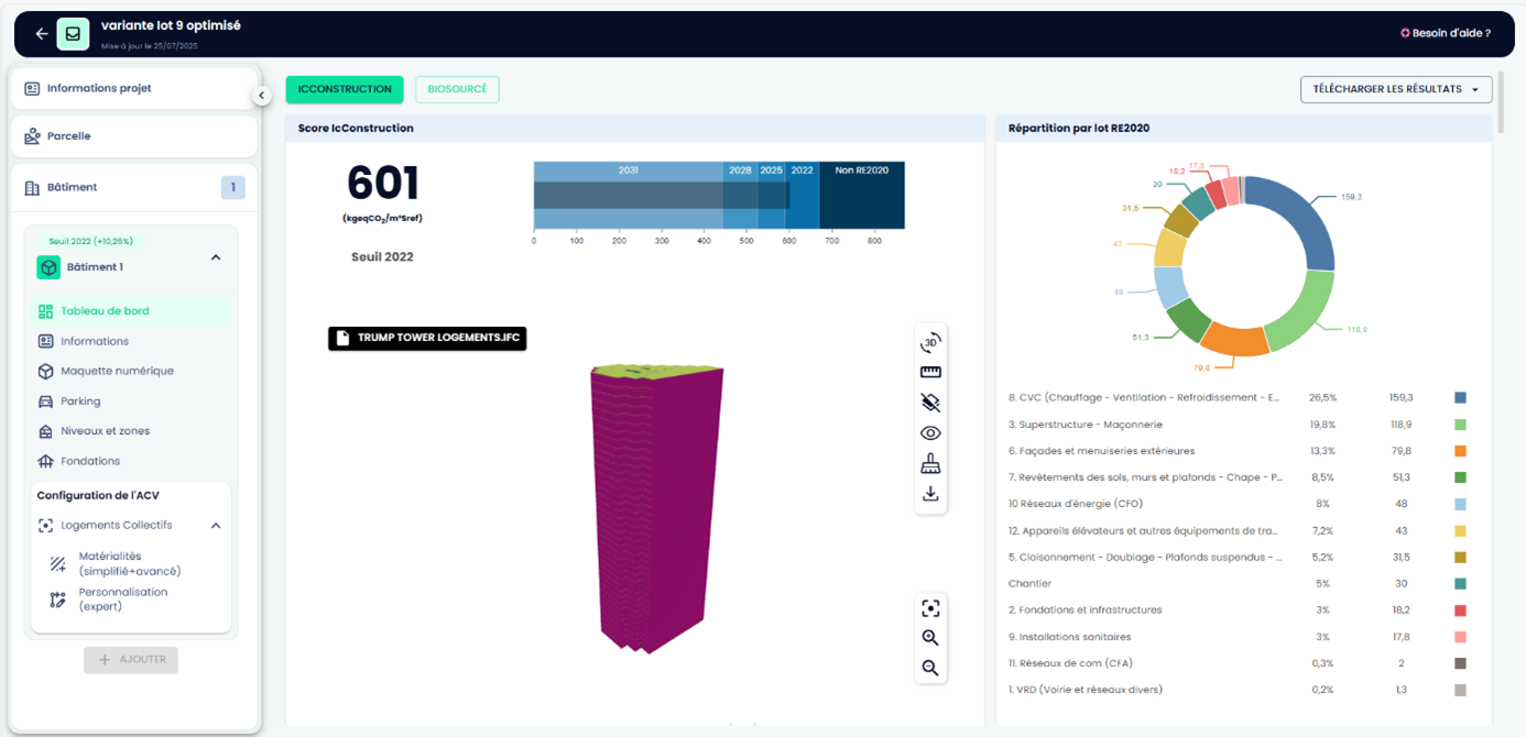 La suite de cette étude détaille les optimisations mises en œuvre sur chacun de ces lots, à partir des données réelles issues du modèle, et montre comment Beem Shot permet de piloter simplement cette trajectoire bas carbone, sans modifier la morphologie du bâtiment.